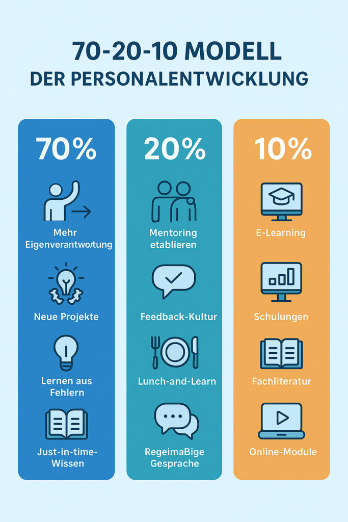 Das 70-20-10-Modell beschreibt, dass 70 % des Lernens durch praktische Erfahrung, 20 % durch Austausch mit anderen und 10 % durch formales Training entsteht.