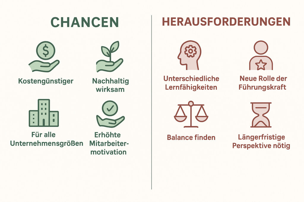 Das Modell bietet echte Chancen. Es kostet oft weniger, funktioniert in Startups wie in Konzernen gleichermaßen, und schafft eine Lernkultur, die echte Ergebnisse liefert.