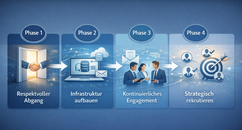 Ein mittelständisches Softwareunternehmen hat dies erfolgreich umgesetzt: Mit halbjährlichen Alumni-Meetups, einer strukturierten LinkedIn-Gruppe und einem Talentpool-System konnten sie in zwei Jahren acht ehemalige Entwickler ohne die üblichen Onboarding-Hürden zurückholen.
