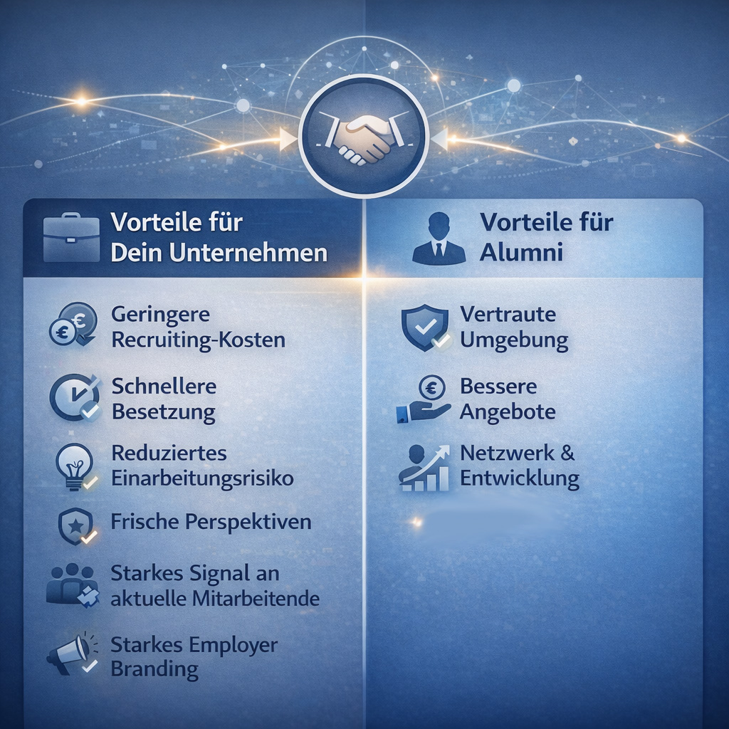 - Schnellere Besetzung: Alumni durchlaufen den Einstellungsprozess schneller; die Background-Checks sind bereits erledigt