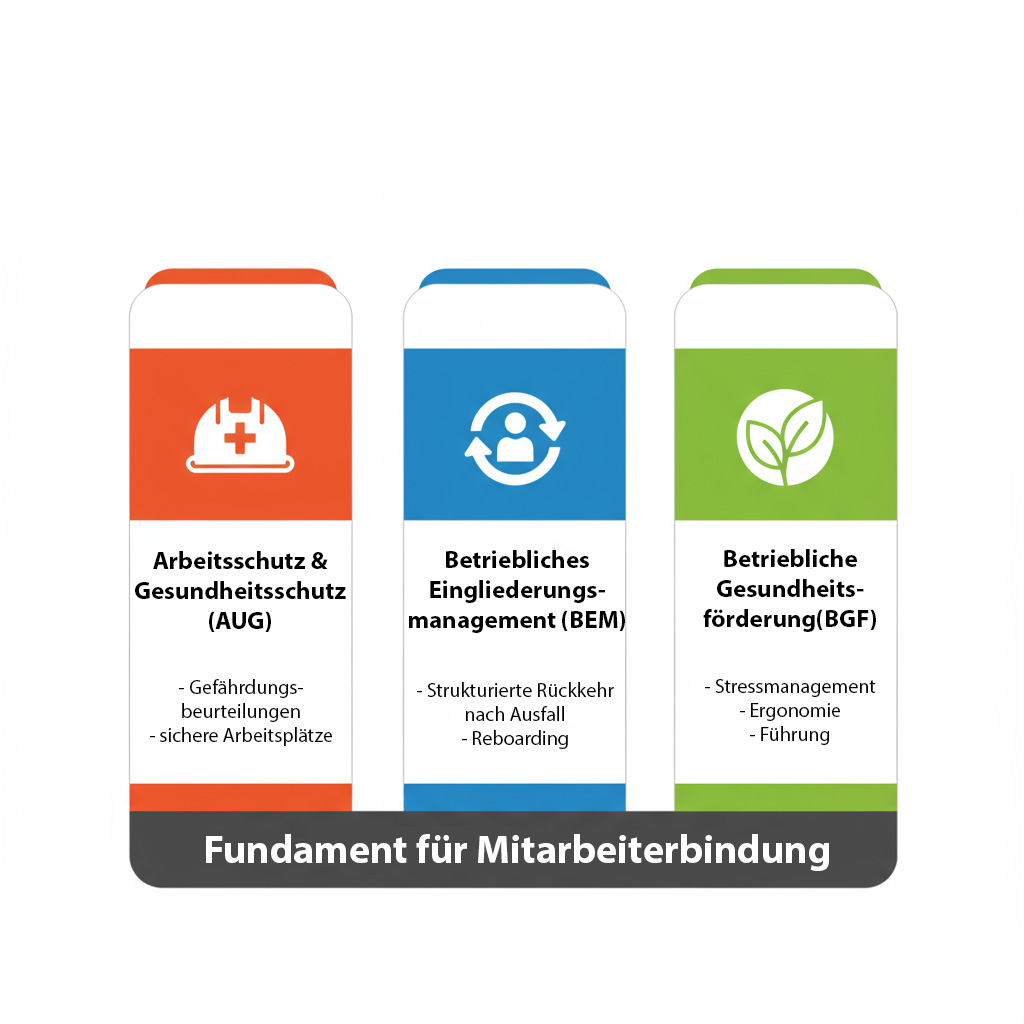 Arbeitsschutz und Gesundheitsschutz (AUG), Betriebliches Eingliederungsmanagement (BEM) und Betriebliche Gesundheitsförderung (BGF).