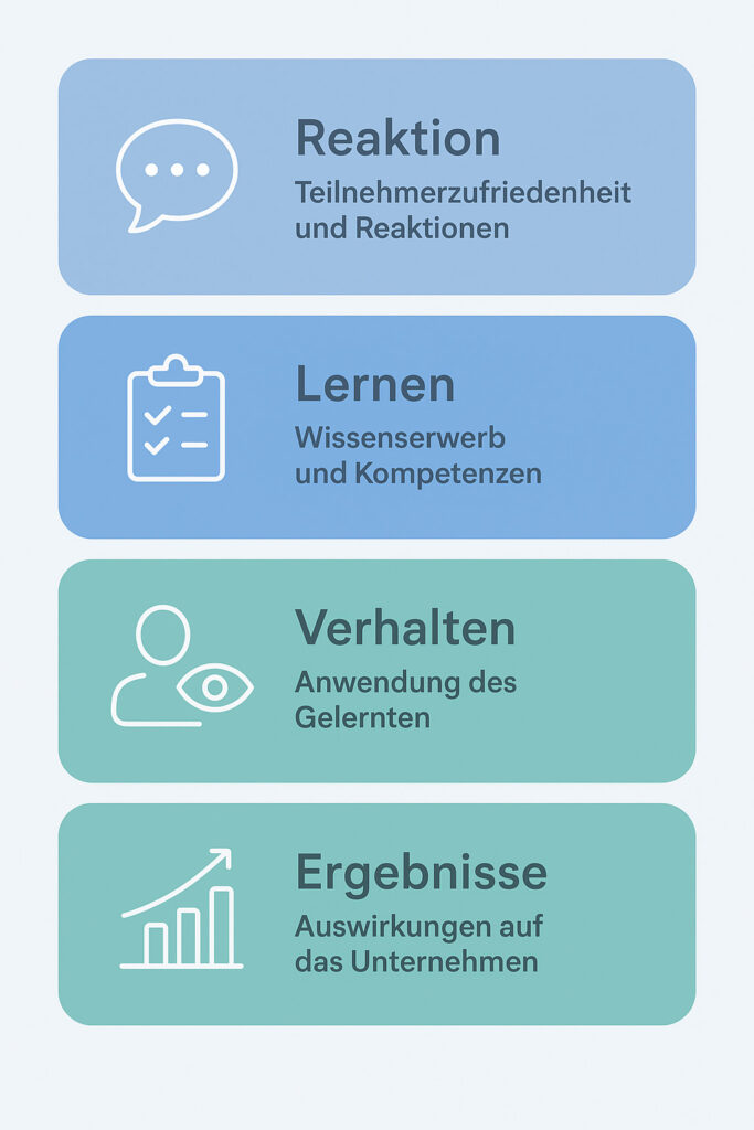 Das Kernprinzip ist elegant. Das Modell arbeitet mit vier aufeinander aufbauenden Ebenen, die von der unmittelbaren Reaktion der Trainingsteilnehmenden bis hin zu den langfristigen organisatorischen Auswirkungen reichen. Nur wenn all diese Ebenen systematisch analysiert werden, lässt sich der tatsächliche Wert einer Schulung erfassen.