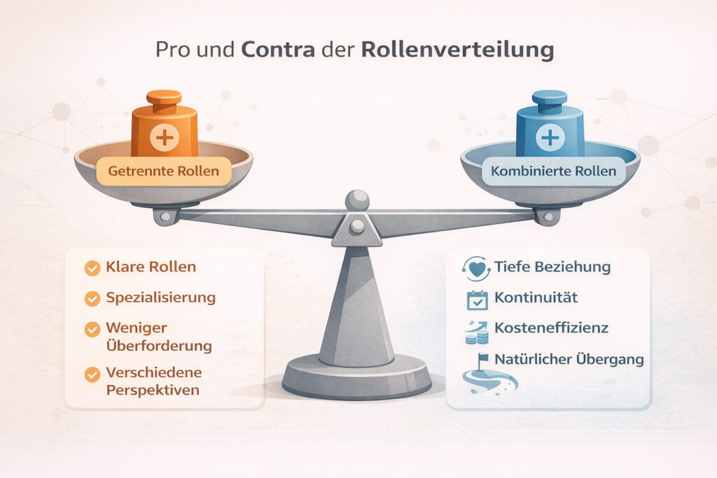 Längerfristiger Zeitaufwand für eine Person: Während getrennte Rollen den Aufwand verteilen, konzentriert sich bei einer Person der Aufwand zeitlich. Intensive erste Monate + kontinuierlicher Mentoring-Kontakt = viel für eine einzelne Person.