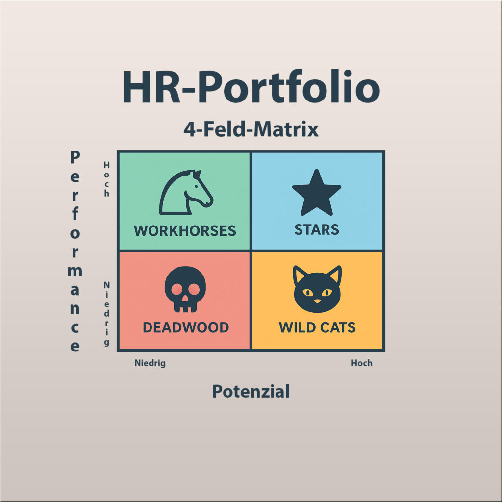 Workhorses (Arbeitstiere): Solide Mitarbeitende mit hoher Leistung, aber begrenztem Entwicklungspotenzial. Sie bilden das Rückgrat des Unternehmens und erbringen verlässlich gute Arbeit auf ihrem Fachgebiet.