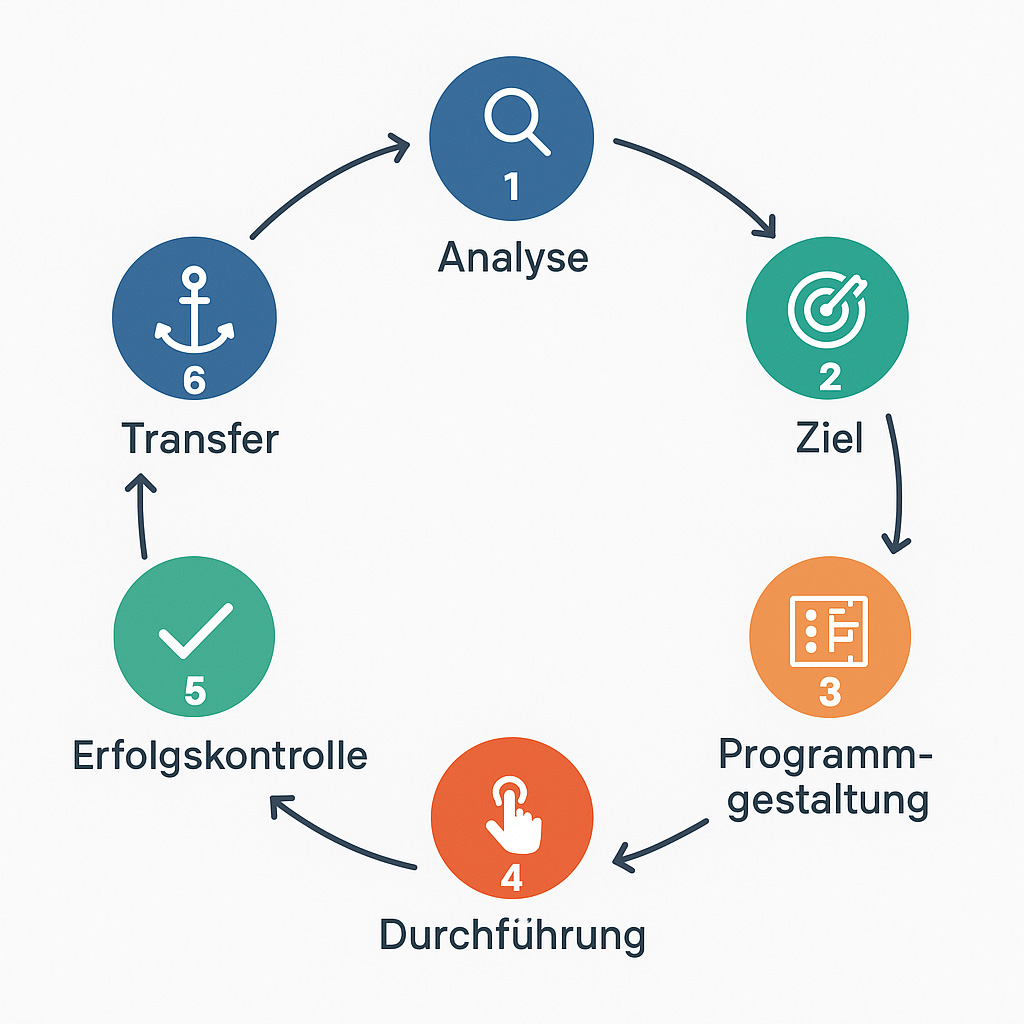 Das Becker-Modell mit seinen sechs Phasen (Bedarfsanalyse, Zieldefinition, Programmgestaltung, Durchführung, Erfolgskontrolle, Transfersicherung) gilt als Standard.