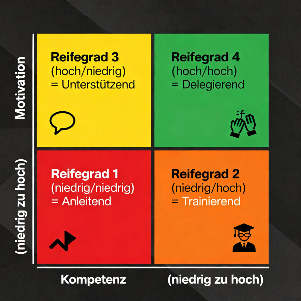 Situative Führung funktioniert nur, wenn Du den Reifegrad Deiner Mitarbeitenden richtig einschätzt. Das ist nicht die persönliche Reife – sondern die aufgabenspezifische Reife: Wie kompetent und motiviert ist jemand bei dieser konkreten Aufgabe?