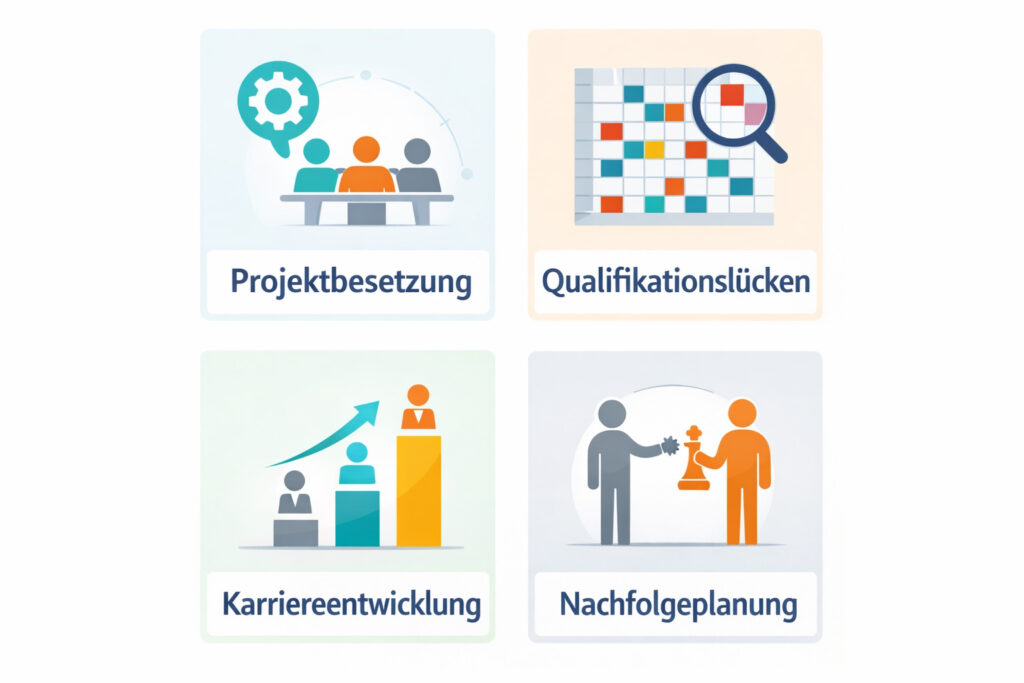 Für Projektplanung, Talententwicklung, Nachfolgeplanung und zur Erkennung von Kompetenzlücken in Teams oder Organisationen.