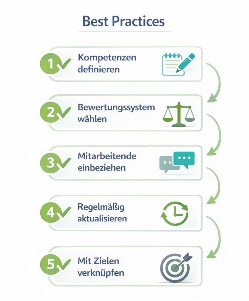 Durch Definition relevanter Kompetenzen, Festlegung von Bewertungsstufen, Einbindung der Mitarbeitenden und regelmäßige Aktualisierung.