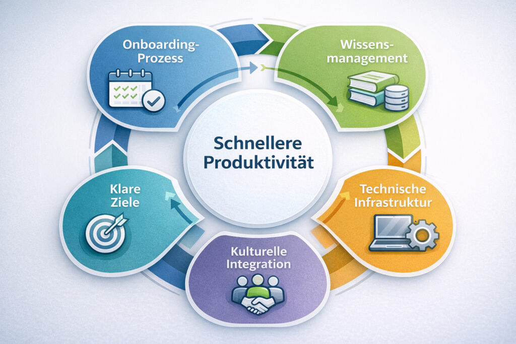 Das ist der Hebel, den Du am ehesten in der Hand hast. Ein strukturiertes Onboarding mit klaren Phasen (Preboarding, Orientierung, Integration, Weiterentwicklung) verkürzt die Zeit bis zur vollen Produktivität deutlich.