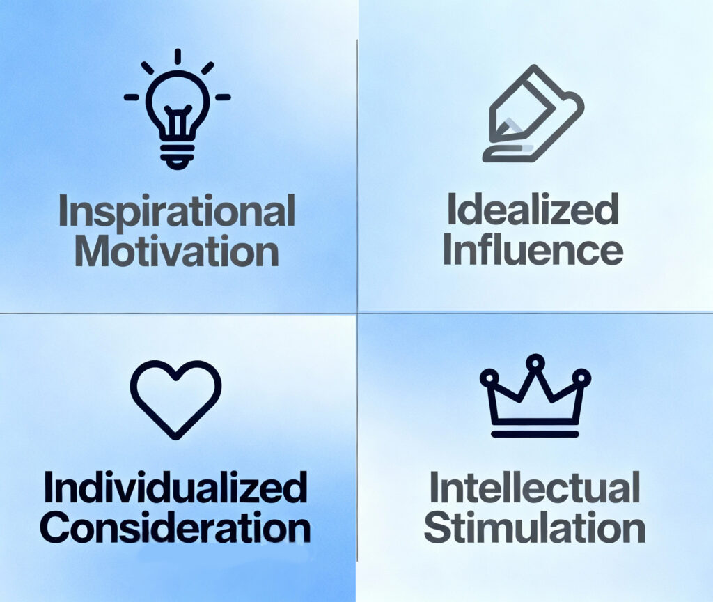 Die Vier I’s: inspirierende Motivation, intellektuelle Stimulation, idealisierter Einfluss und individuelle Berücksichtigung.